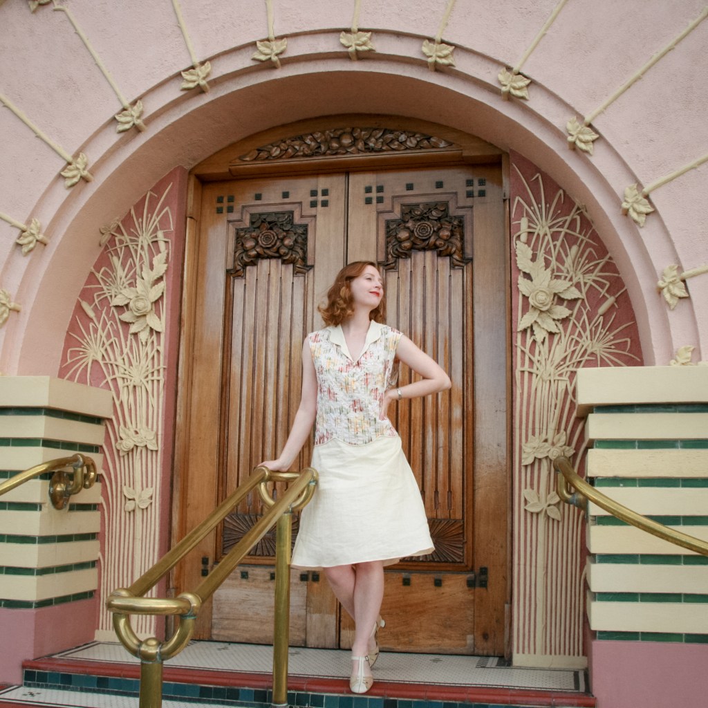 This cute 1920’s day style is perfect for relaxing summer days. Made with cream linen skirt and collar, with the bodice in stretch cotton, it simply pulls over the head and hangs elegantly.